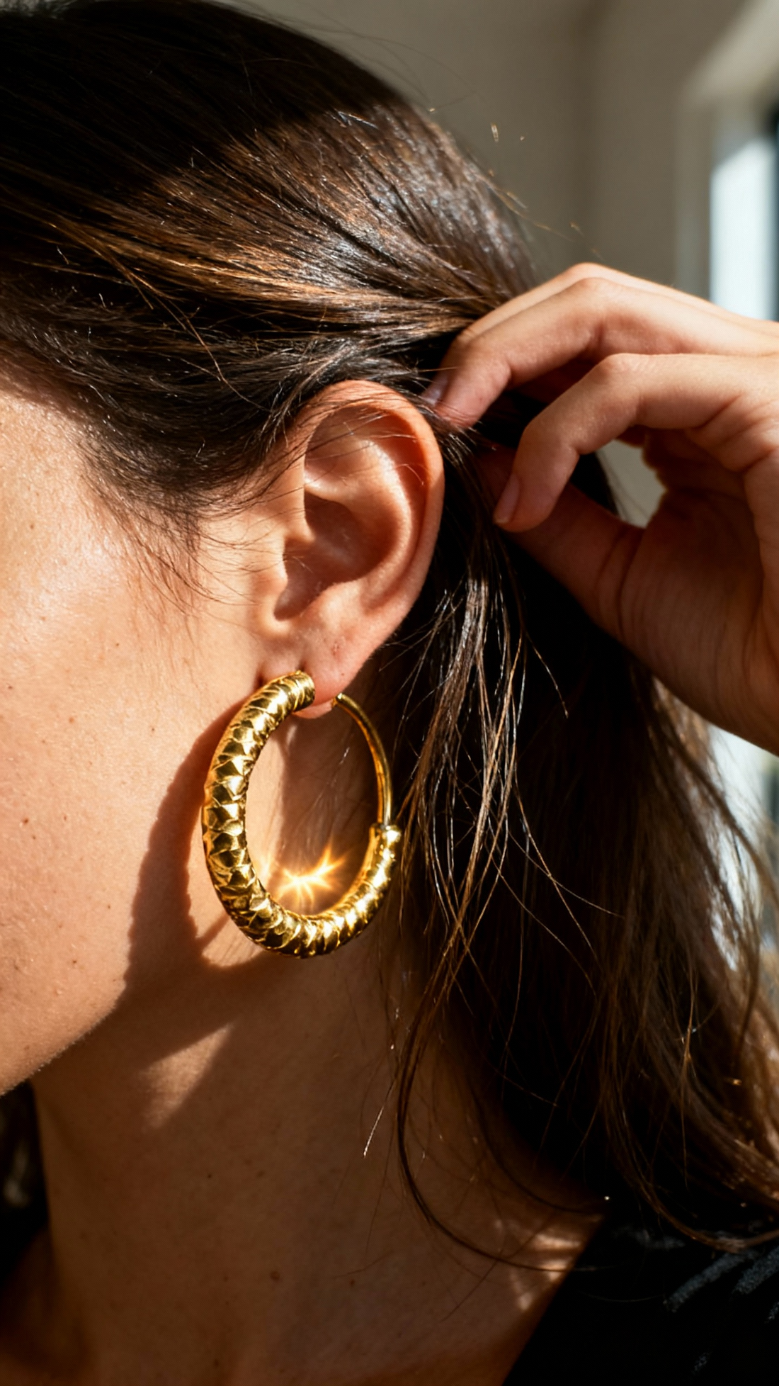 Tre coppie di mini–hoop dorati in tre misure graduate, con superficie a micro-rilievi regolari che...