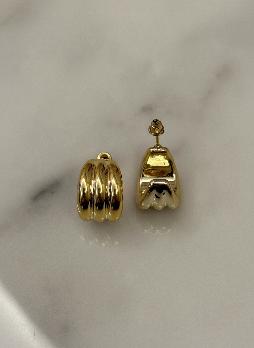 Mini-hoop scultoreo dal volume bombé con coste morbide e finitura a specchio. Linee essenziali, carattere deciso: illumina il viso e si abbina a tutto, dal denim al blazer. Chiusura a perno con farfallina, profilo confortevole pensato per l’uso quotidiano.