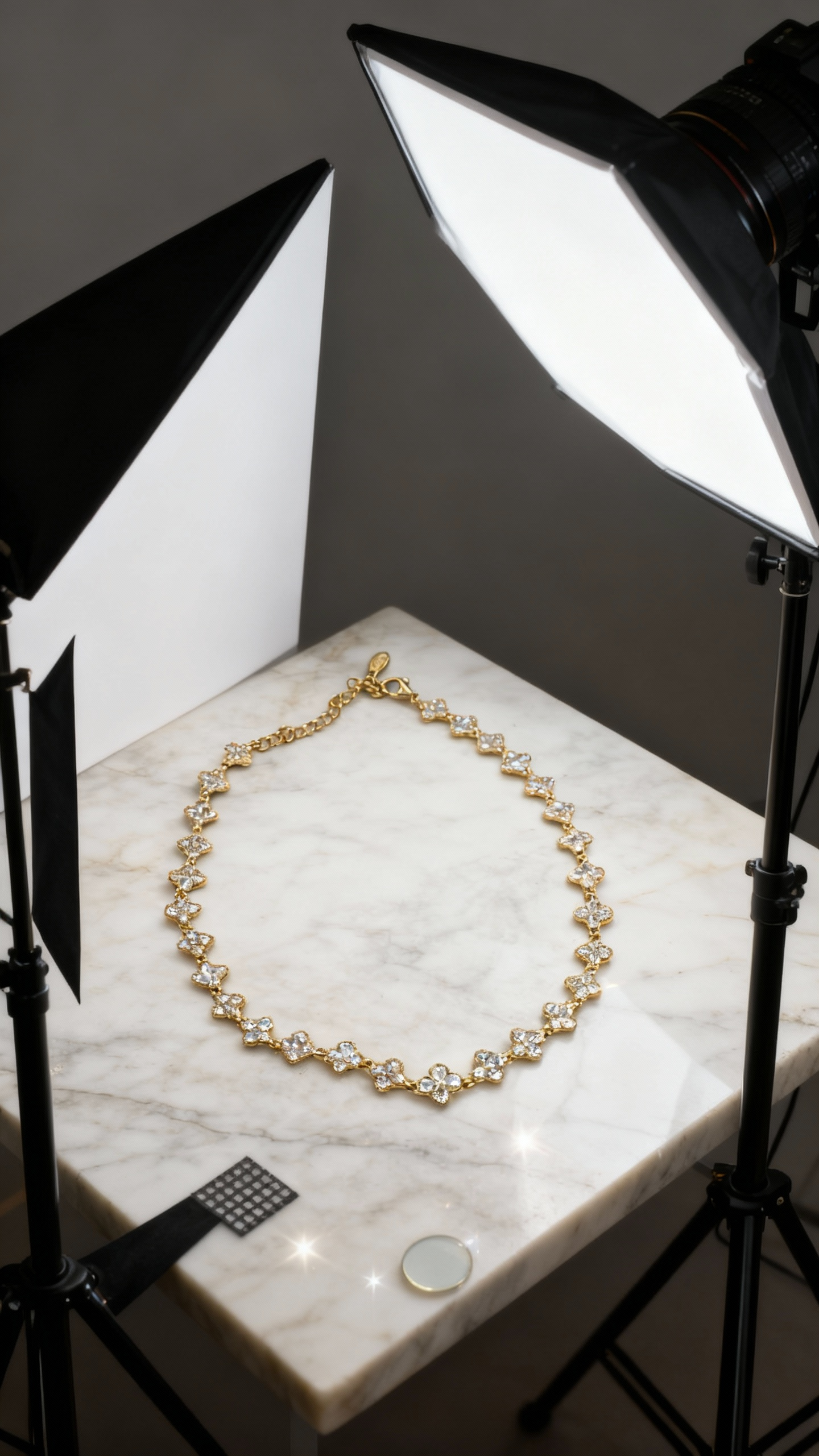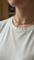 Una fila di piccoli quadrifogli tempestati di cristalli chiari corre lungo tutta la catena, per un effetto luminoso e raffinato. Finitura gold tone a specchio, chiusura a moschettone con prolunga regolabile per indossarla corta tipo choker o leggermente più lunga. Leggera, brillante, perfetta da sola o in layering.