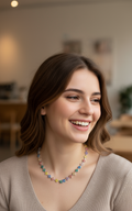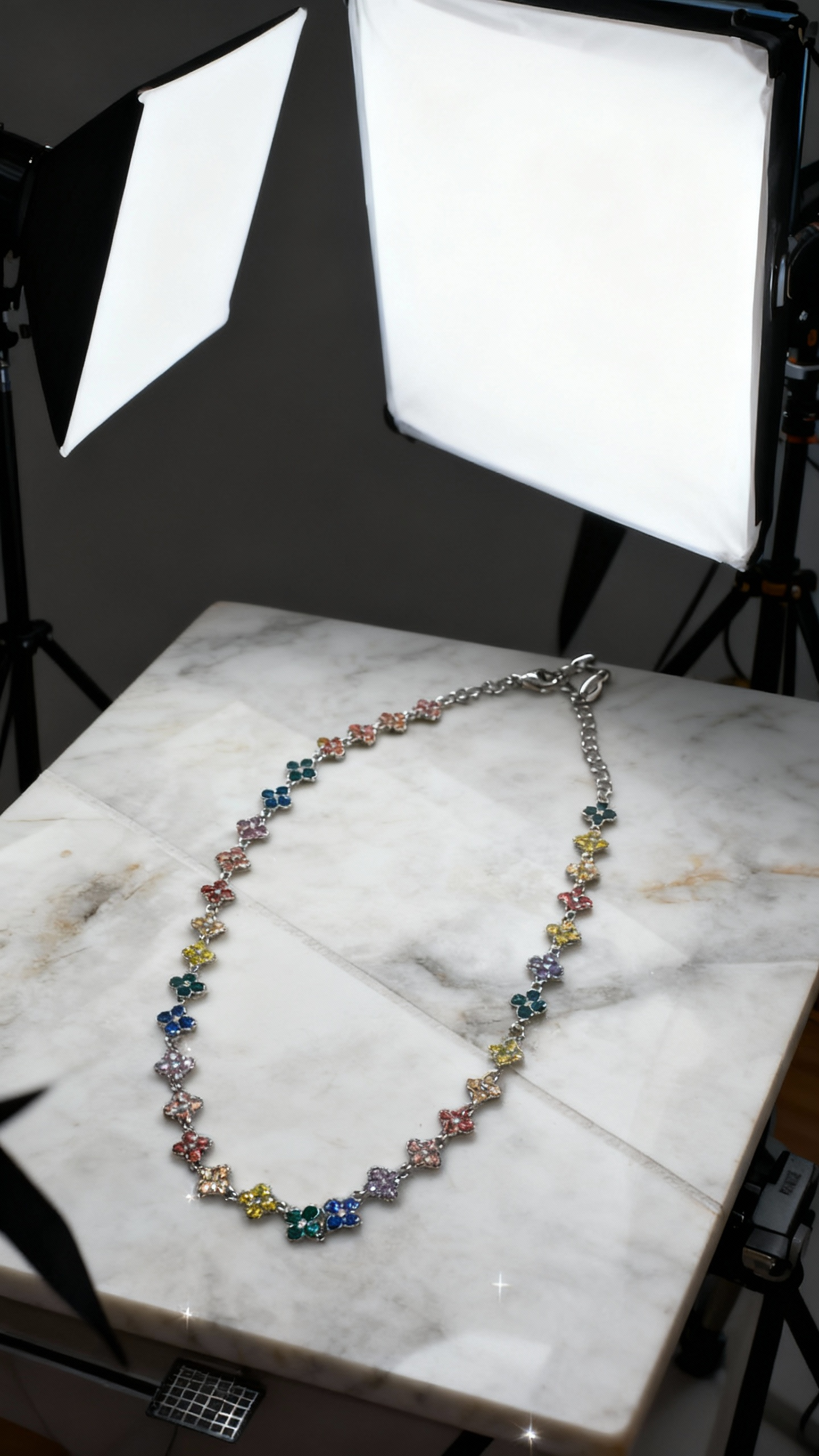Una sequenza di piccoli quadrifogli tempestati di strass colorati corre lungo tutta la catena, creando un effetto arcobaleno brillante. Finitura metallica silver tone, chiusura a moschettone con prolunga regolabile per adattare la lunghezza. Un gioiello leggero e allegro che illumina il décolleté, perfetto da solo o in layering.