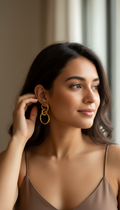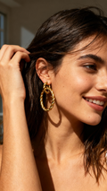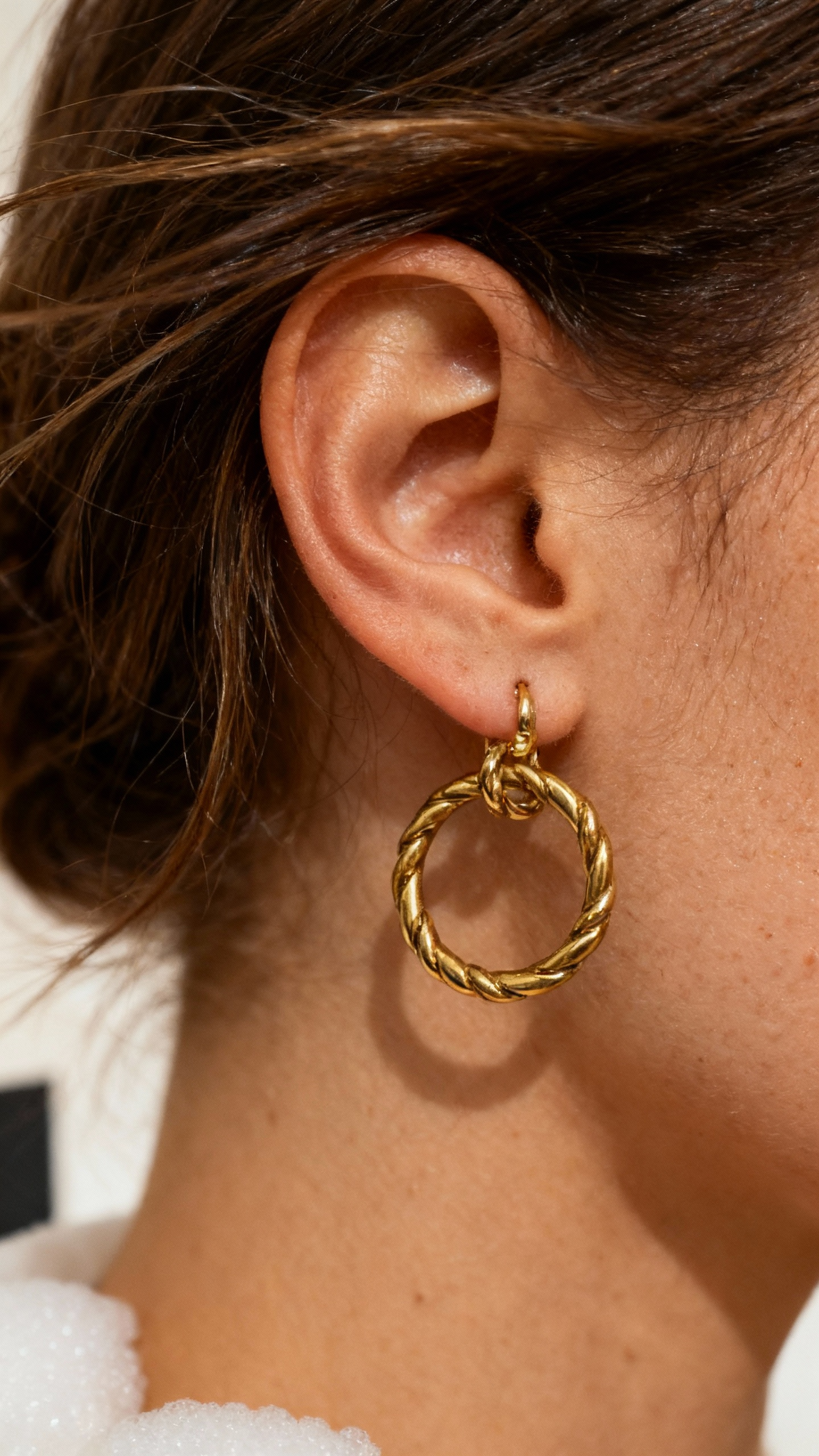 Due anelli intrecciati dall’effetto martellato/rope in finitura gold lucente si muovono leggeri ad ogni passo. La chiusura è a perno con farfallina; il design viene valorizzato dal piccolo cerchio superiore che collega il cerchio maxi inferiore per un look minimal ma d’impatto. Perfetti per illuminare blazer, camicie e top serali.