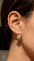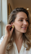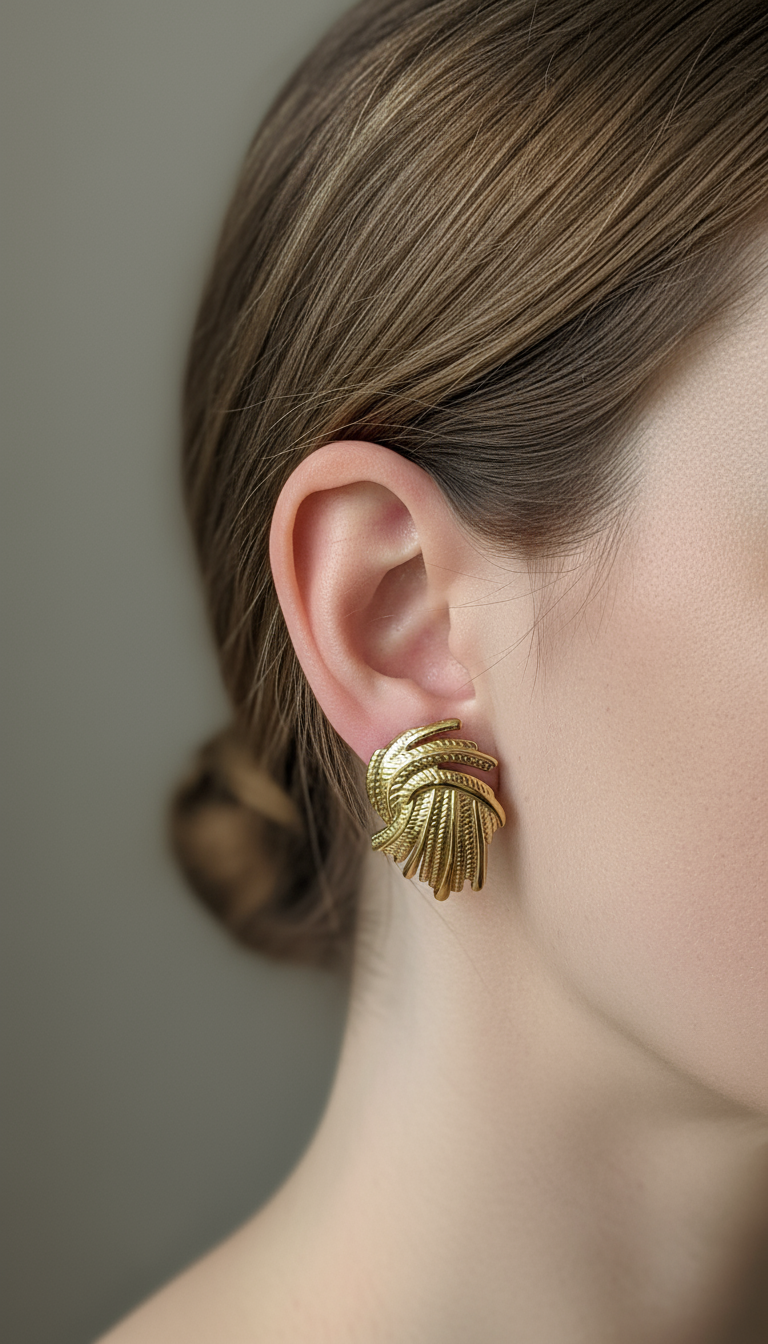 Iconici e luminosi: il motivo a nodo intrecciato con superfici martellate in finitura oro specchiata crea riflessi ricchi e tridimensionali. Un volume compatto ma scenografico, ideale con blazer, camicie e knitwear. Chiusura a perno con farfallina, comfort quotidiano.