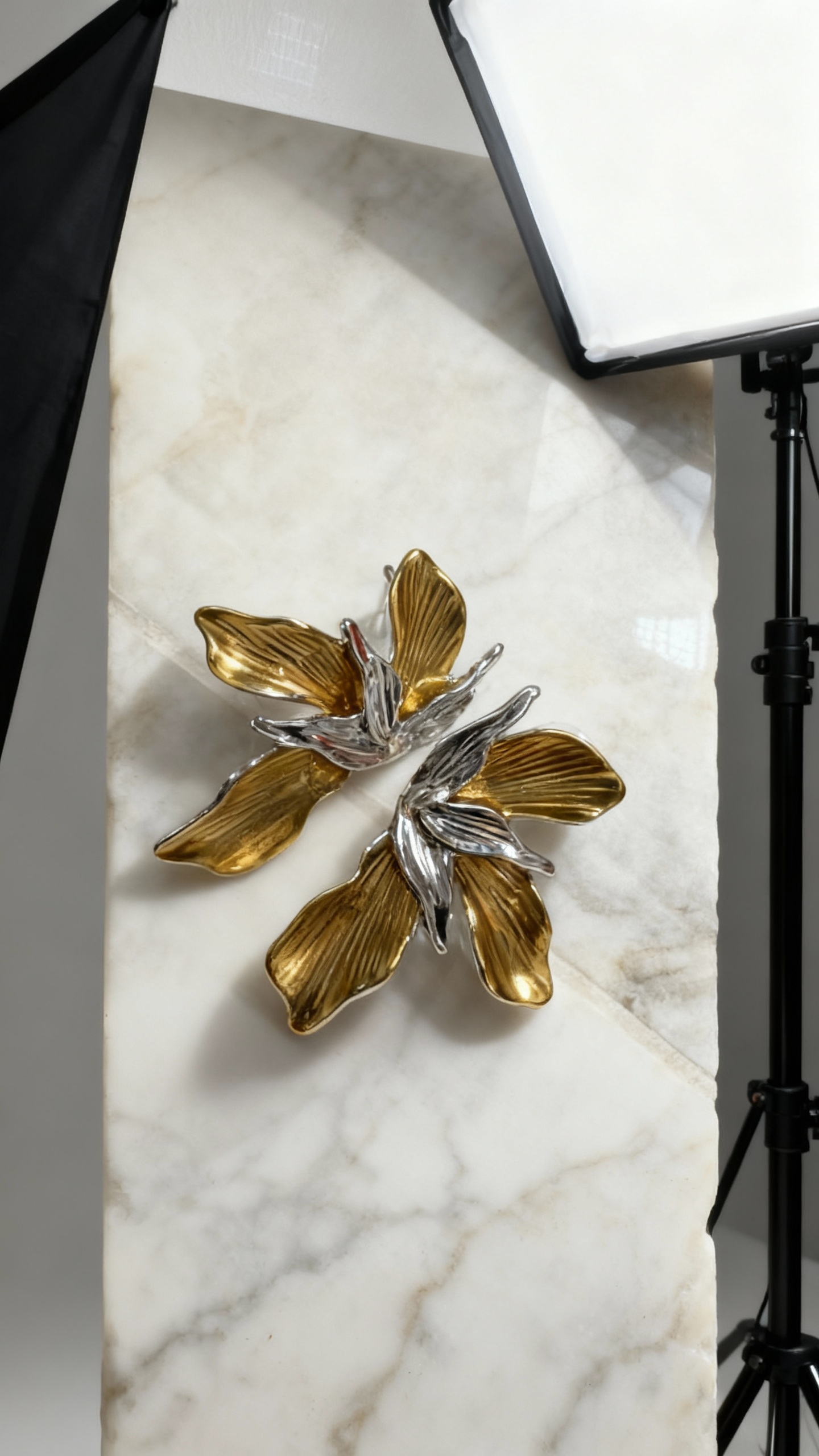 Orecchini scultorei a mezzo fiore: petali rigati a specchio con mix di finitura gold e silver che cattura la luce da ogni angolo. Design leggero ma scenografico, perfetto per dare personalità anche ai look più semplici. Chiusura a perno con farfallina. Un piccolo statement quotidiano, elegante e contemporaneo.