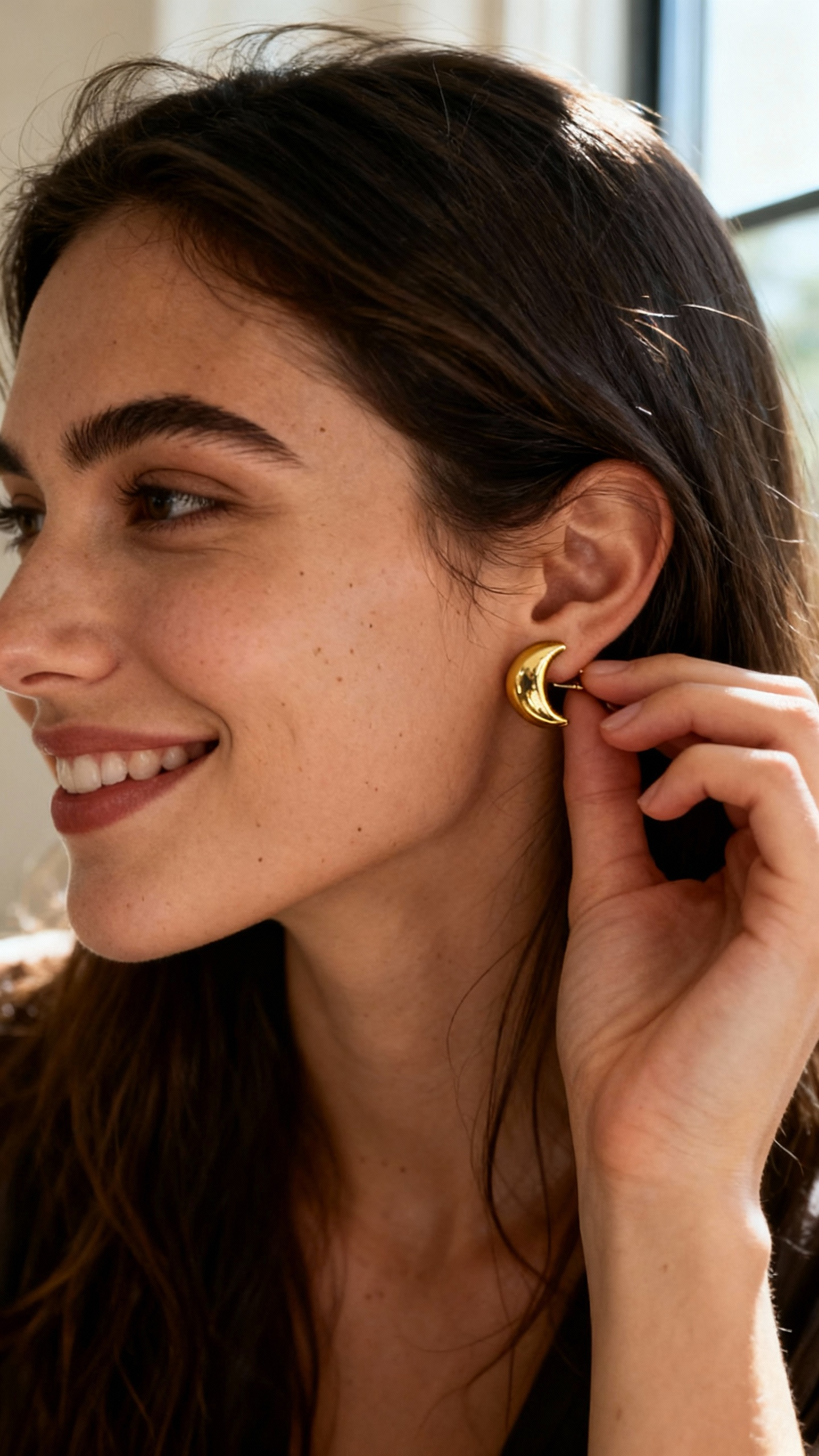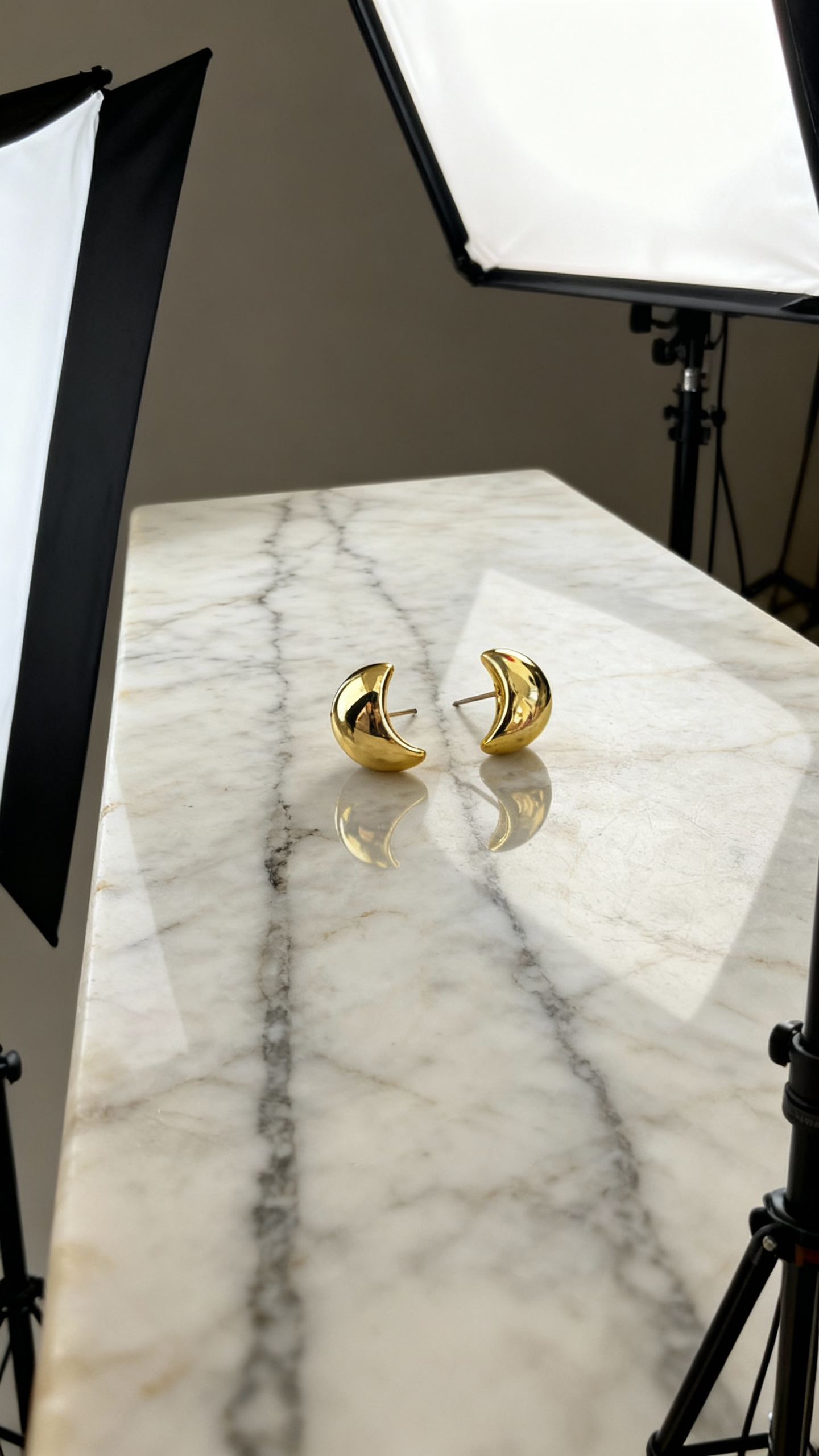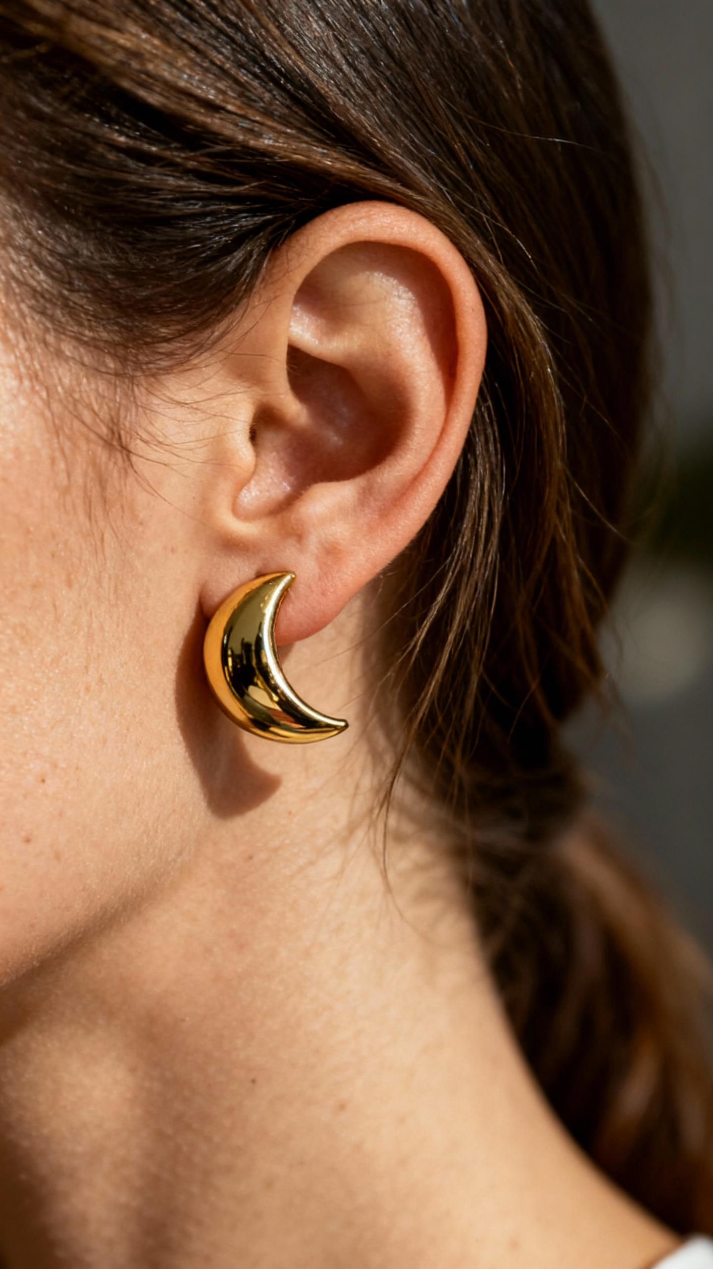 Volumi morbidi e finitura a specchio: la mezza luna dorata abbraccia il lobo con un profilo scultoreo essenziale che illumina il viso. Leggero ma d’impatto, perfetto dal giorno alla sera. Chiusura a perno con farfallina.